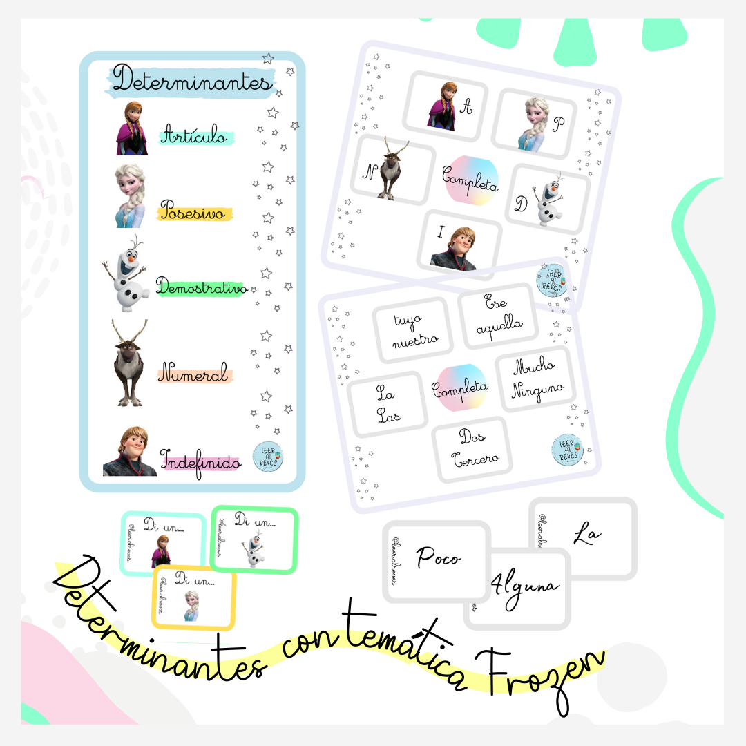Este recurso se compone de diferentes plantillas y más de 45 tarjetas donde aparecen personajes que hacen referencia a un determinante concreto.
