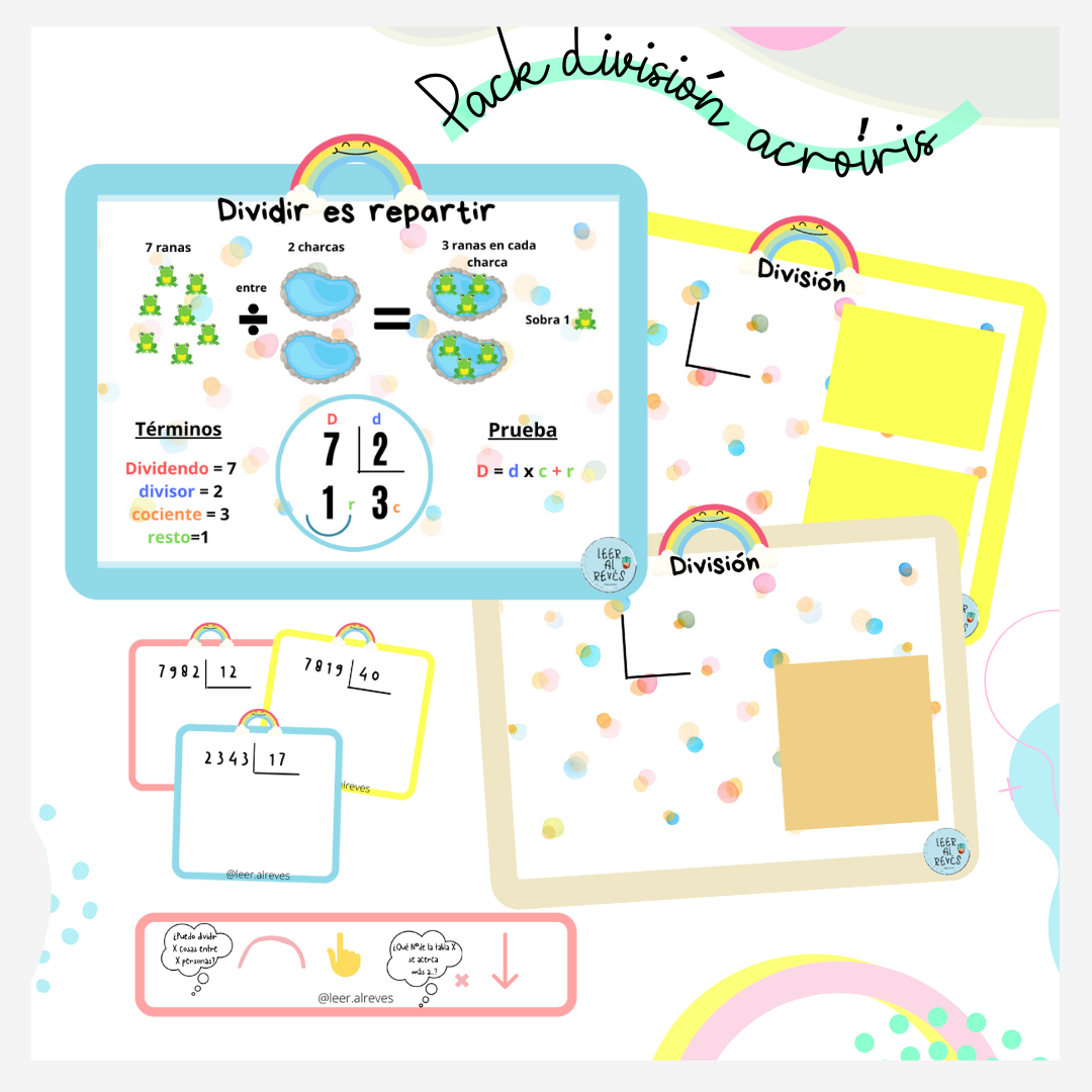 Este pack incluye: tarjeta explicativa, tarjetas para aprender a dividir de forma manipulativa y entender el concepto de «repartir», tarjetas con divisiones y auto instrucciones.
