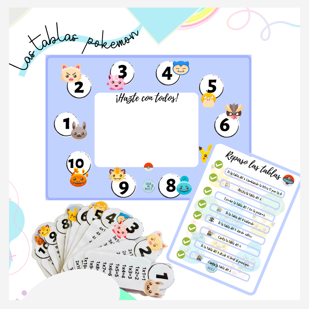 Incluye un tablero con todos los pokemon, todas las tablas con su pokemon asociado y un apartado para repasar las tablas de forma divertida: saltando, cantando, bailando…